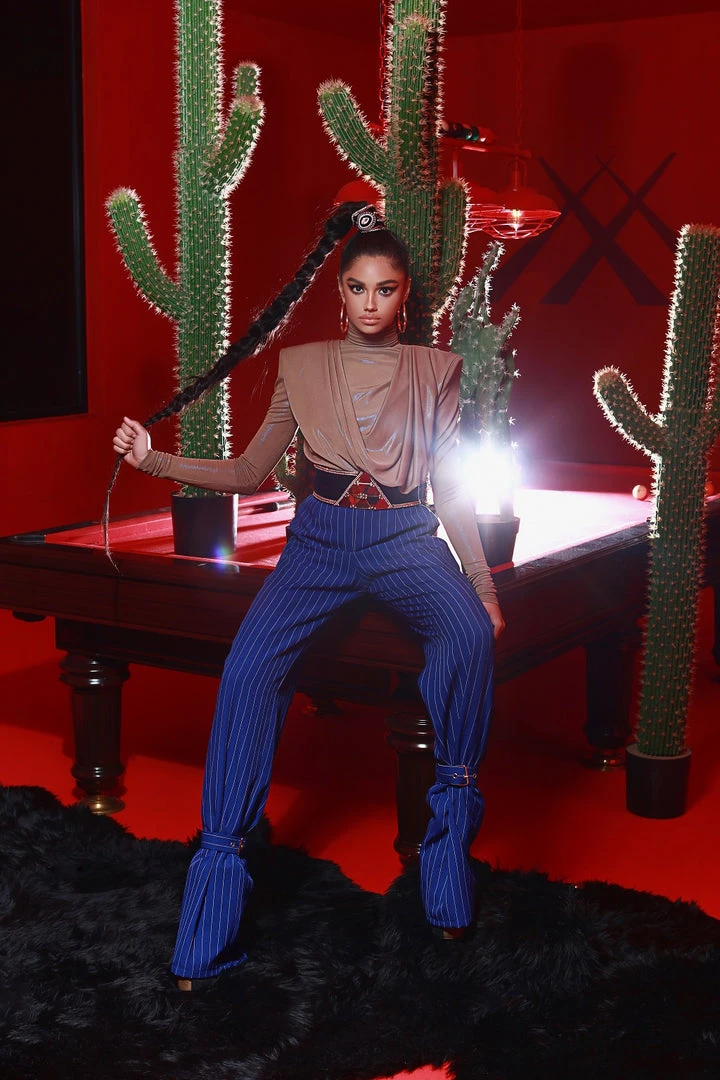 This set comes with a high neck loose ruffled shirt with long sleeves, combined with high waisted pants with a belt at the bottom that is made with triangle mirrors and little stones. The two ultimate combined colors make the perfect outfit for a night occasion for you. DRESS