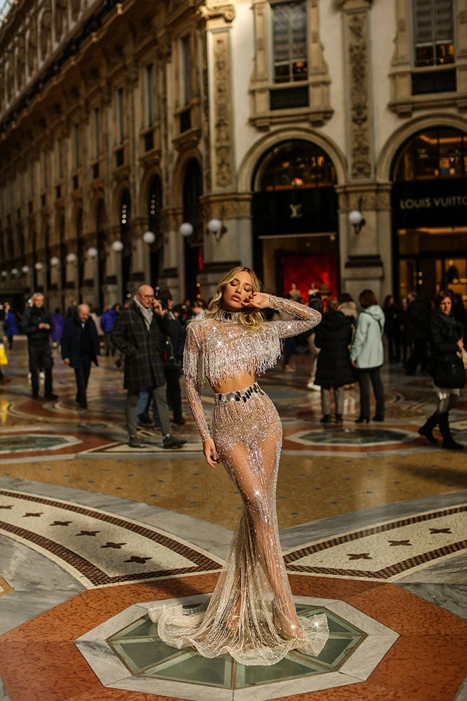 Description: Silver crop top and long skirt set, all embellished in crystal tassels, rhinestones and mirror details.