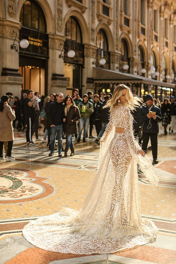 Description: White crop top and long skirt set, with loose kimono sleeves, high neck, closed back, all embellished in shiny white beads, stones and tassels.