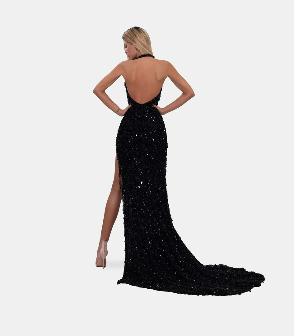 Description: Long dress embroidered with black crystals. Long train, front slit and open back.