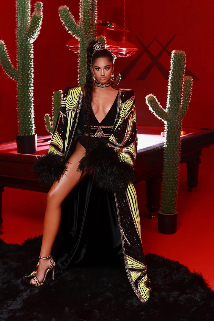 This black tight bodysuit comes with a deep v-neckline and black belt adorned with stones. It provides a long cape in neon yellow and black, designed with sequins and black feathers on both wrists. You can combine this voluminous cape and conquer every occasion. Bodysuit