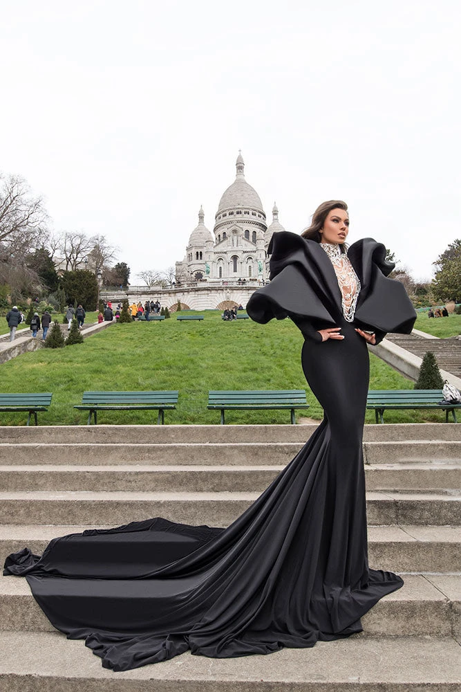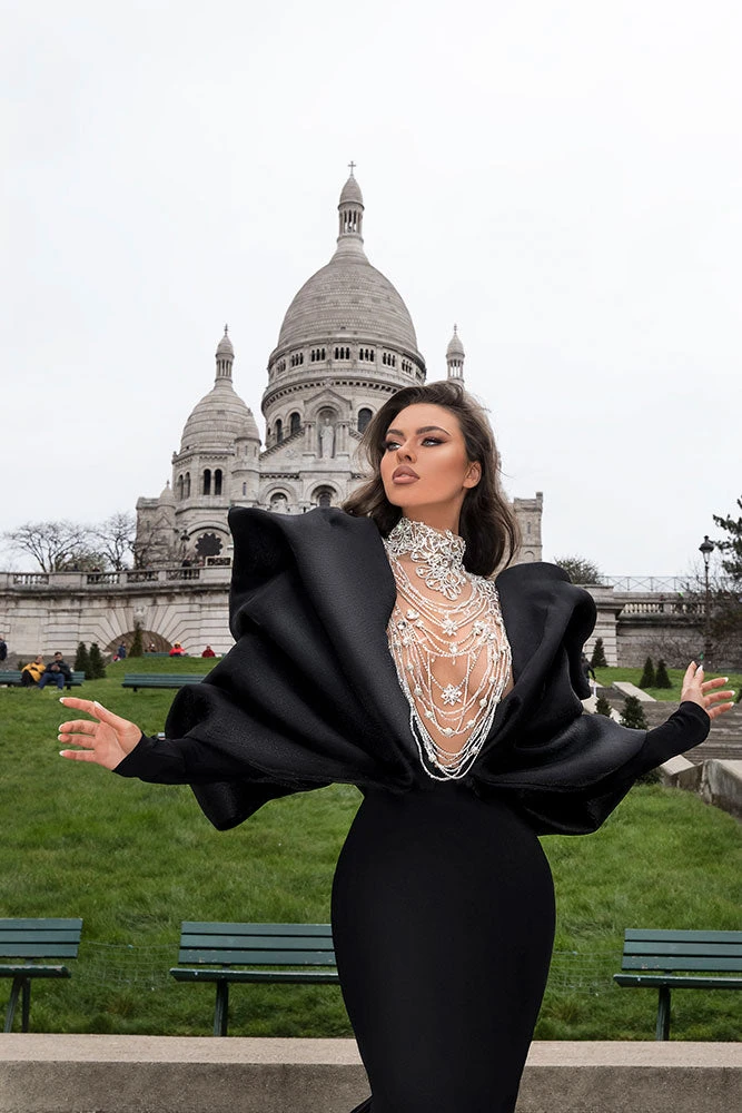 Description: Black long dress with broad puffy ruffled shoulder sleeves, open front all detailed in stones and crystals.