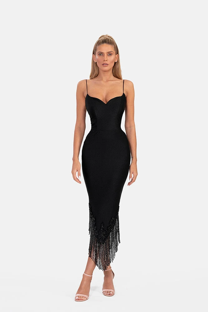 Description: Corset black dress with spaghetti straps, slim fit with crystals tassels in the bottom in which gives the dress a classy sophisticated look.