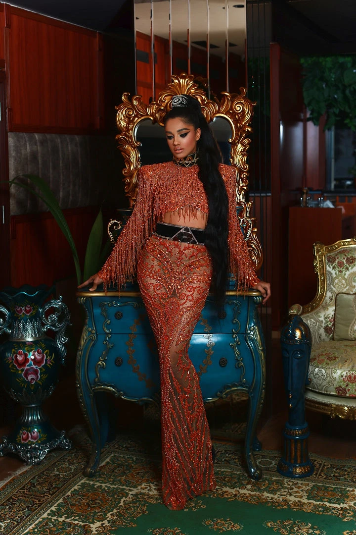 This Crop top has long sleeves and wide shoulders, adorned in beads tassels, lace long dress embroidered with beads and sequins, combined with a waist belt made with gold chains and a triangle. DRESS