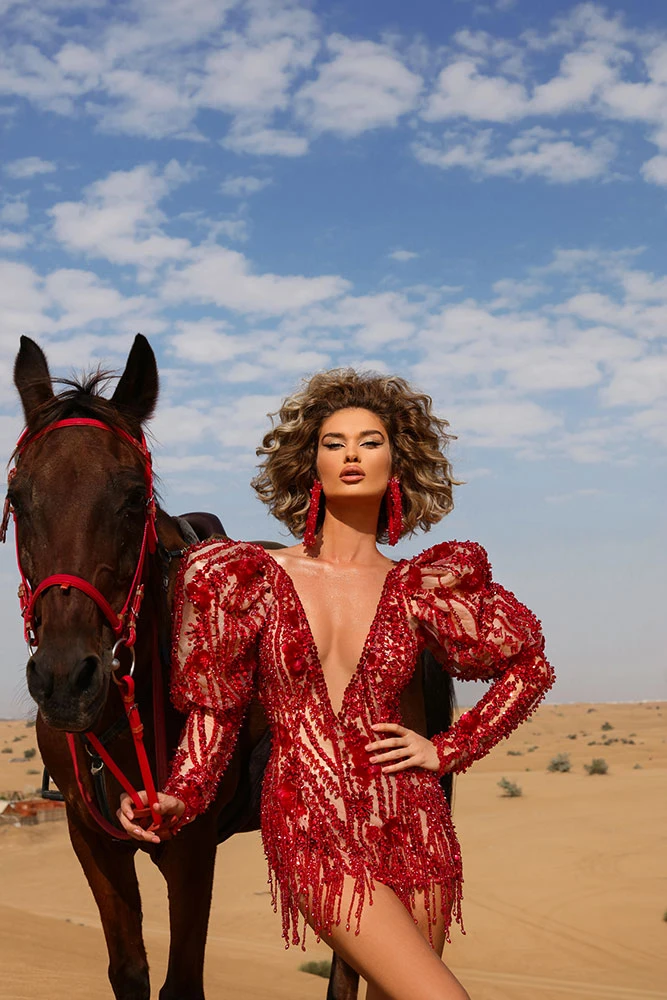 Description: Short Red Dress with puffed out sleeves,long deep V neckline, long sleeves, fringes added to the bottom. The dress also provide earrings.