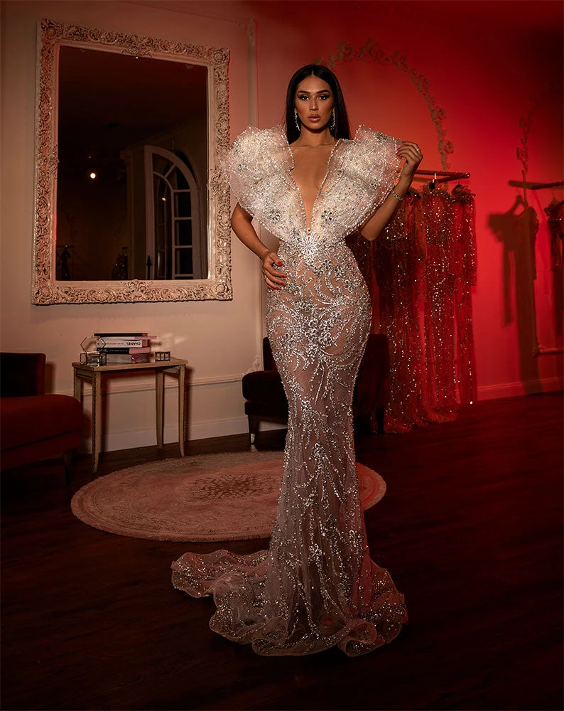 Description: White in silver long dress with layered ruffled broad shoulders that go perfectly along the V-neckline and into the back.