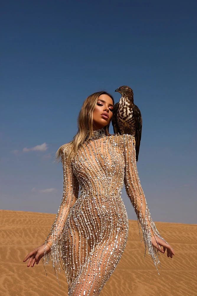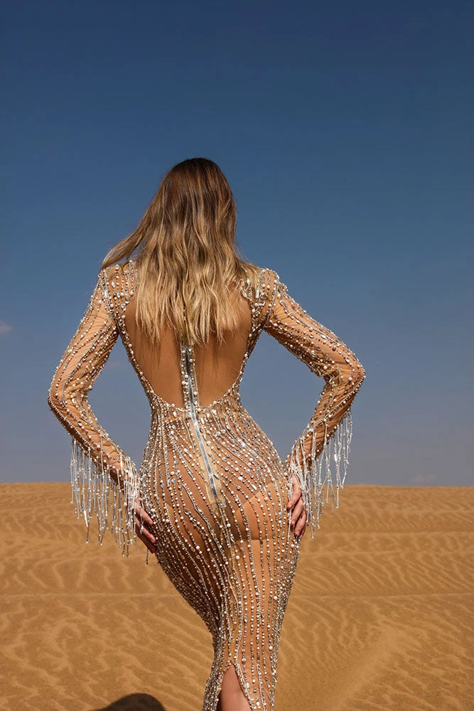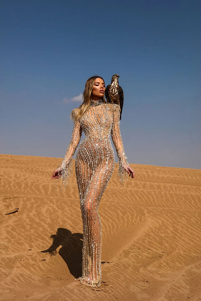 Description: Floor length crystal dress, with high neck, open back and long sleeves. The dress is embellished in stones, pearls, crystals and rhinestones.
