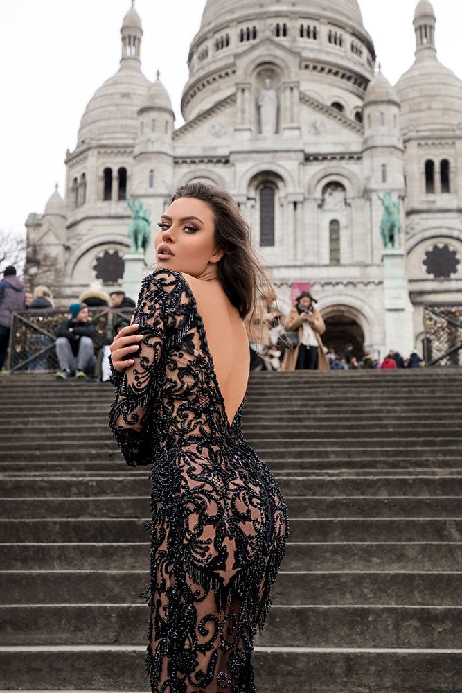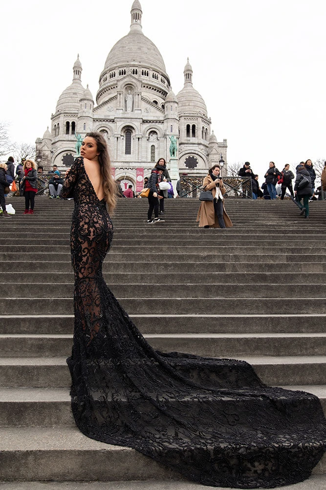 Description: Lace black dress with long sleeves and deep V neckline and back like.