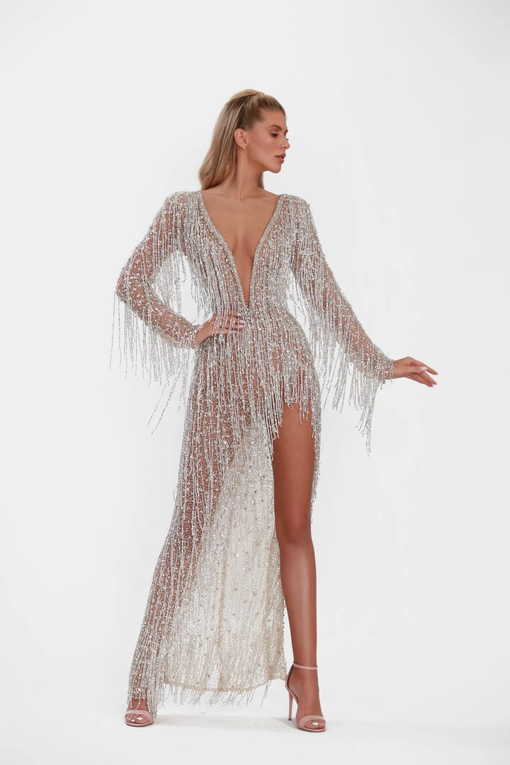 Red carpet worthy gown featuring fringes all over, deep v neckline, and a side slit that shows off your beautiful legs.