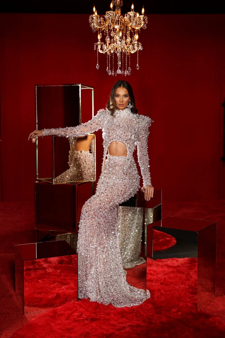 High neck with structured shoulders, cut out on the waist area, with crystals all over.