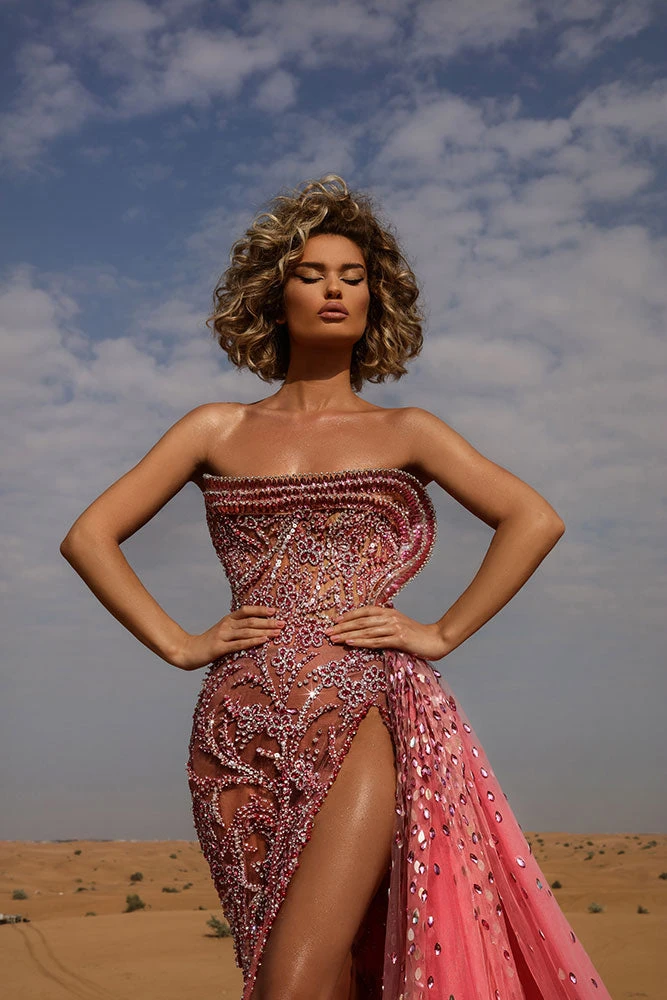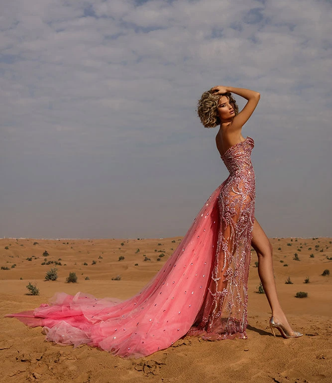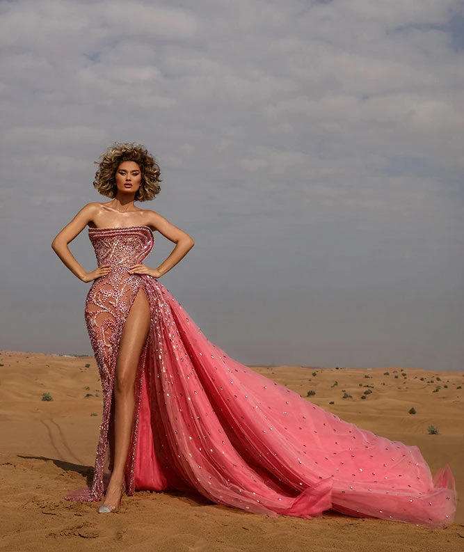 Description: Pink Corset dress with long detachable train,high open slit on the left leg,with folded layers to the top,embroidered in crystals and stones.