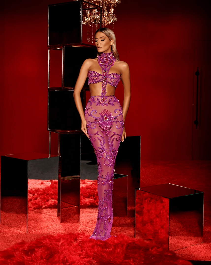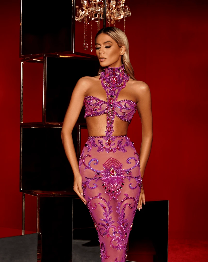 Long Purple Dress, see-through fabric, with cut-outs in the waist area, purple stones, and crystals designs.