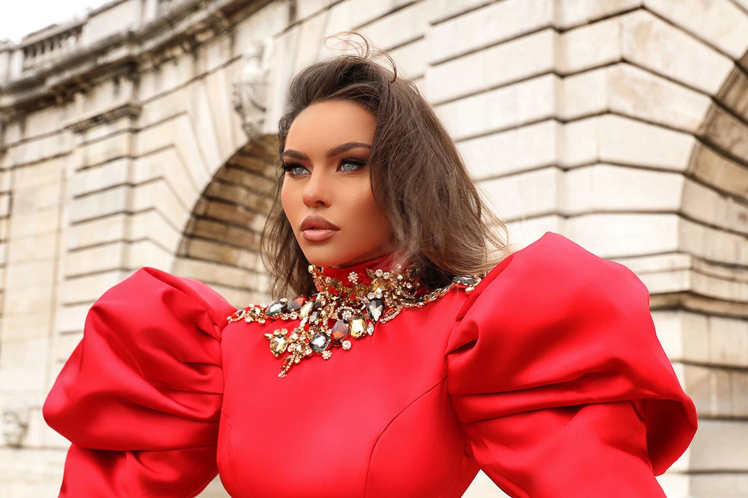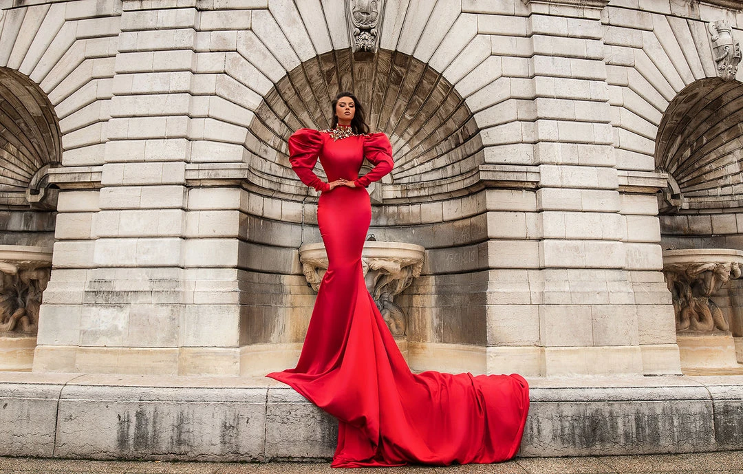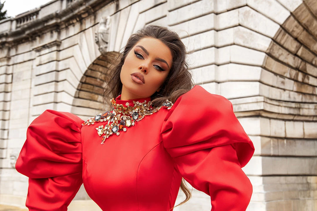 Description: Red long dress, long puffy sleeves and sweeping train, high neck detailed with stones and crystals.