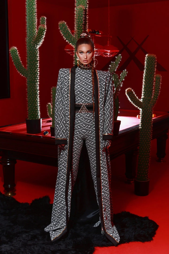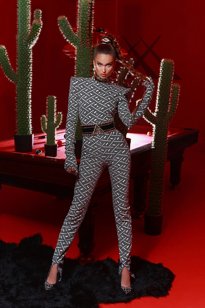 Exuding boldness this printed pattern jumpsuit as a graphic pattern A gives you the confident look. This Black and white seamless pattern jumpsuit gives your shoulders a wider look, combined with a belt and choker that are made with gold chains and a triangle with crystals to make you look more glamorous, and also a long cape in the same pattern with AD embroidered in the back. JUMPSUIT