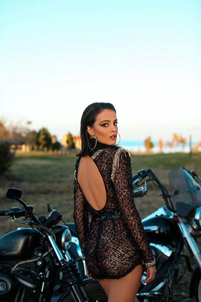 Description: Short dress all embellished in gold and black details. The dress also provides black belt with gold details.