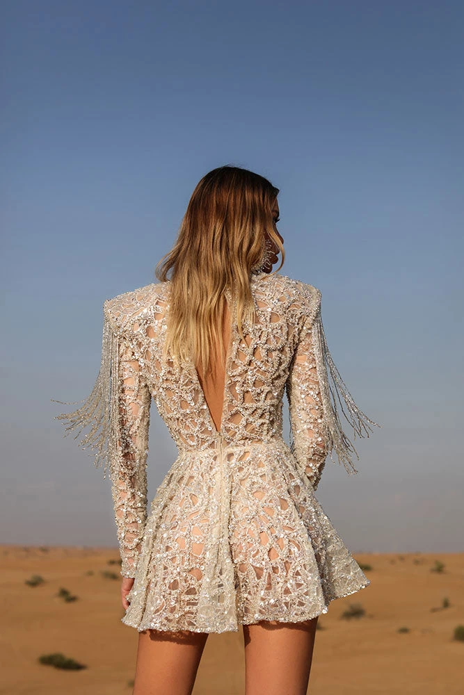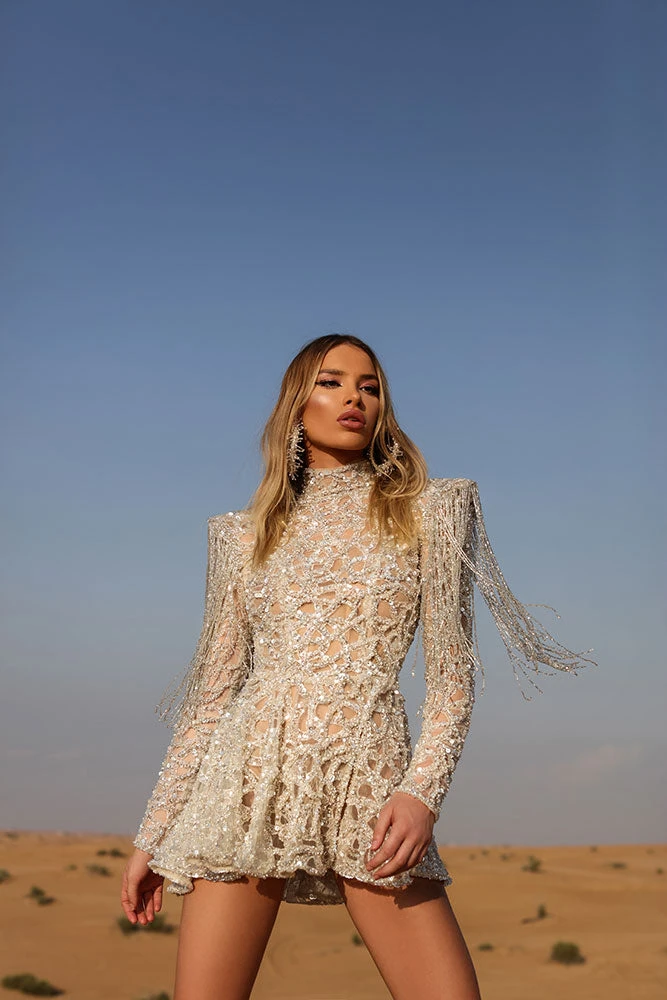 Description: Short Silver Dress with high neck,long sleeves and fringes added to the shoulders. Established in stones and crystals. The dress also provides earrings.