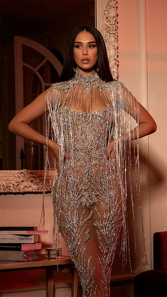 Descirption: Sleeveless Slim fitted dress all embellished in silver. Embroidered in Silver crystals, stones, sequins, and fringes.