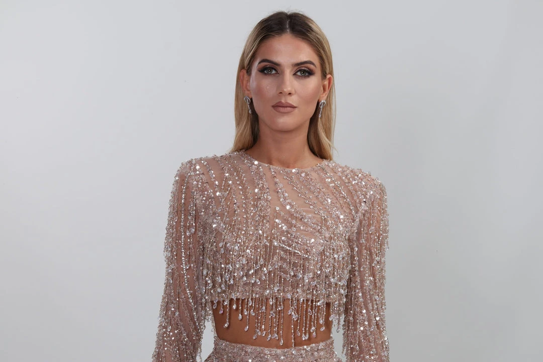 Featuring a crop top with hanging fringes, and a floor-length dress beautified with beads, crystals and stones all over.