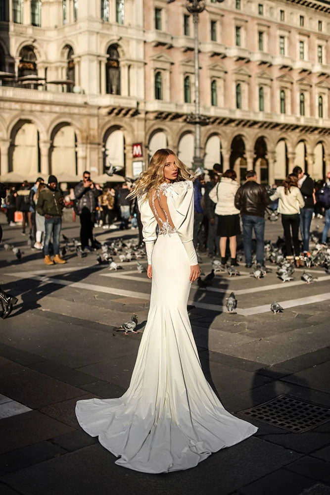 Description: White dress with details in the front that perfectly blend into the the broad puffy shoulders and the open back. The dress has a deep front slit and a long floor length train.