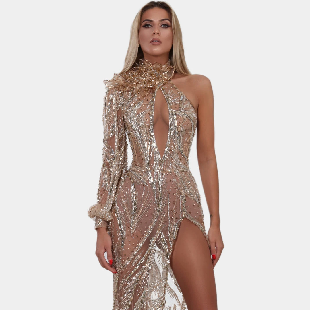 Description: Gold embellished gown with high neck, one loose sleeve, fitted dress. With gold fringes, stones and sequin embroidery.